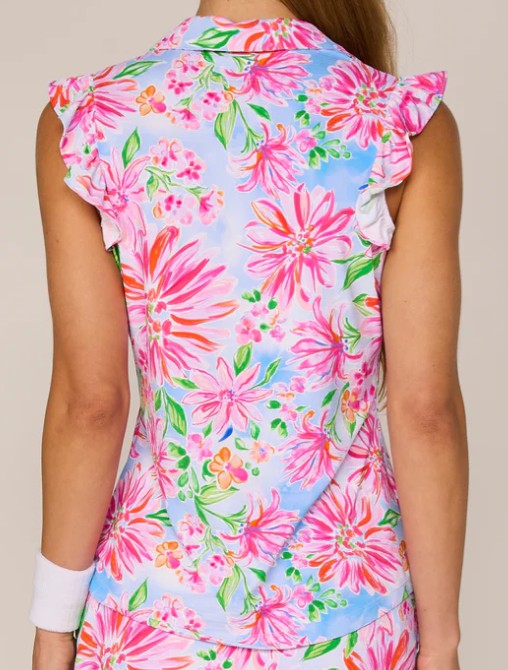 G Lifestyle SLEEVELESS RUFFLE TOP W/ GOLD BUTTONS in Flower Garden