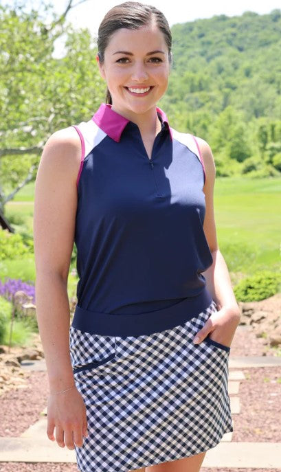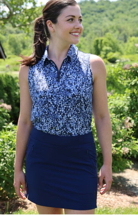 G Lifestyle MOODBOARD Sleeveless Ruffle Polo Top in Diamond Geo Navy