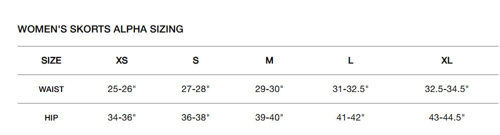 - SKORT LENGTH BY SIZE: XS – 15 1/8”, S – 15 1/2”, M – 15 7/8”, L – 16 1/4”, XL – 16 5/8”
