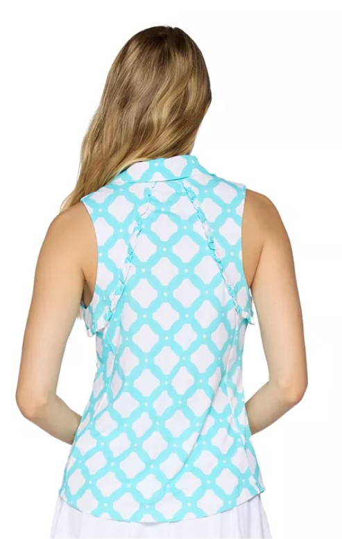 G Lifestyle Women's Golf Sleeveless Top Ruffle - Geo Caribbean Turquoise