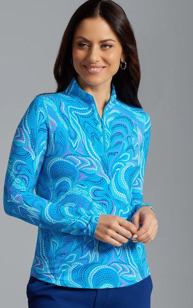 IBKUL Women's Golf Long Sleeve Mock Neck Top Rebecca Print - Turquoise Multi